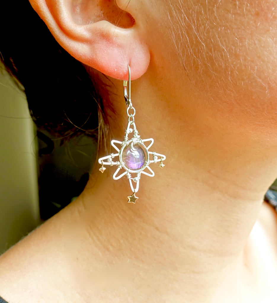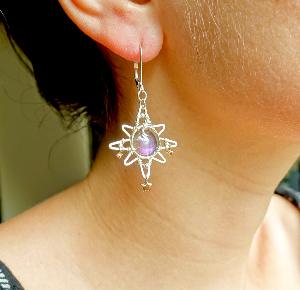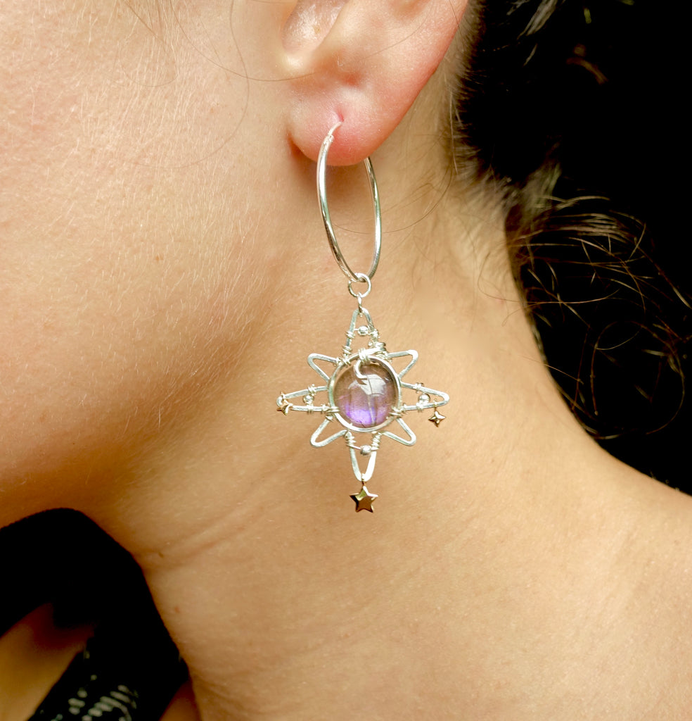 This unique design features a labradorite bead, silver star charm, and sterling silver wire. The star sits at a height and width of 1 inch. Please choose between a sterling silver hoop or hook.