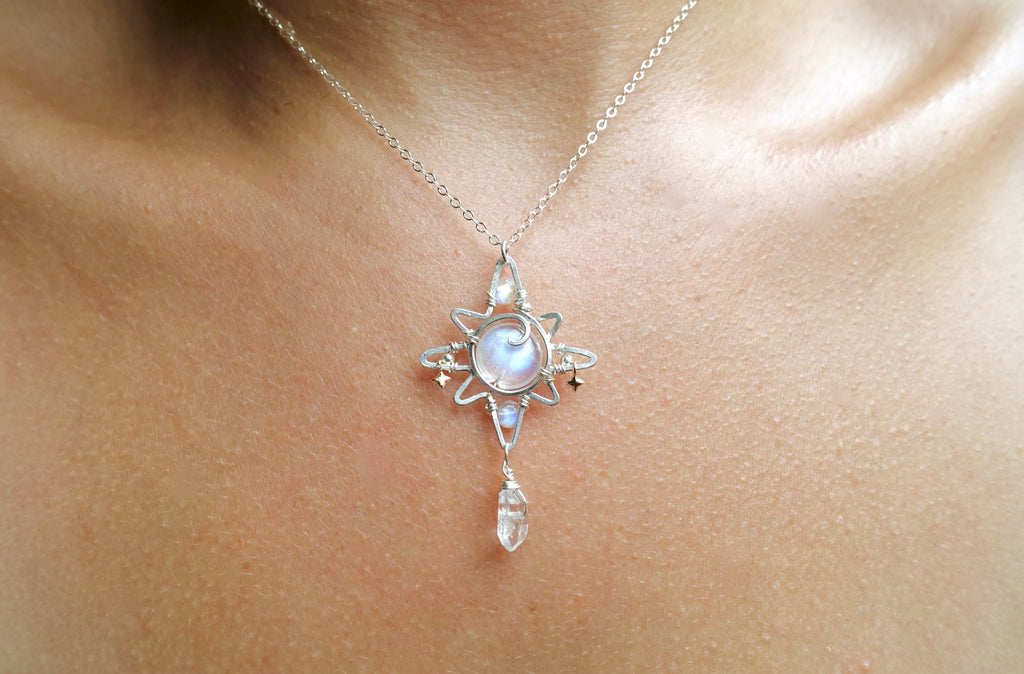 This unique design features a rainbow moonstone bead, dangling quartz crystal, two smaller moonstone beads, two silver star charms, and sterling silver wire. It sits at a height of 1.6 inches and width of 1 inch. Please choose between a 16, 18 or 20 inch sterling silver chain.