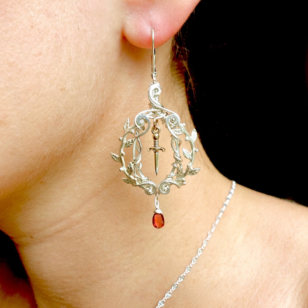This unique design features a garnet drop, a silver dagger charm, silver vine charms, and sterling silver wire. It sits at a height of 2.5 inches.