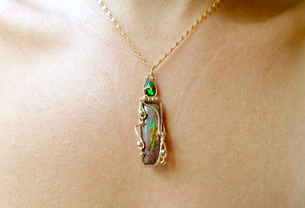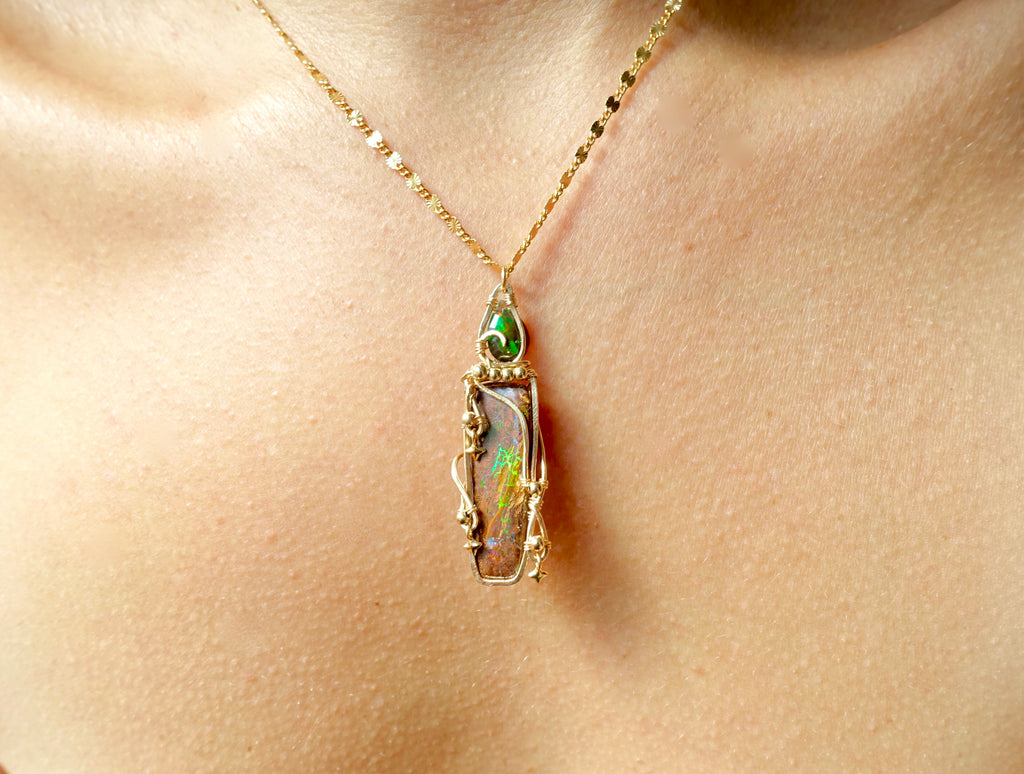 Inspired by Hocus Pocus, this unique design features a stunning boulder opal "candlestick", faceted black opal "flame", and 14k gold fill wire. It sits at a height of 1.5 inches. Please choose between a 16 or 18 inch 14k gold fill chain.