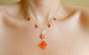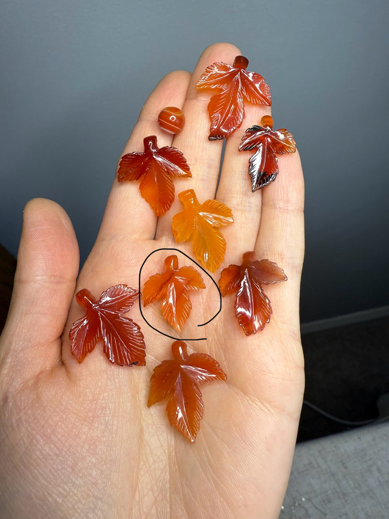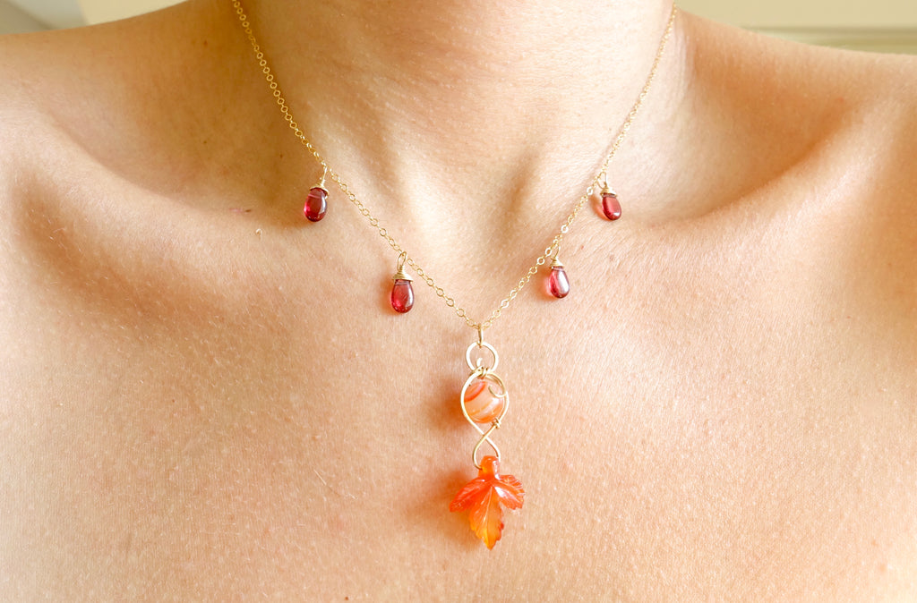 This necklace includes a chosen carnelian Autumn leaf & bead with garnet beads in gold. It will come in an 18” chain with a 2” extender.
