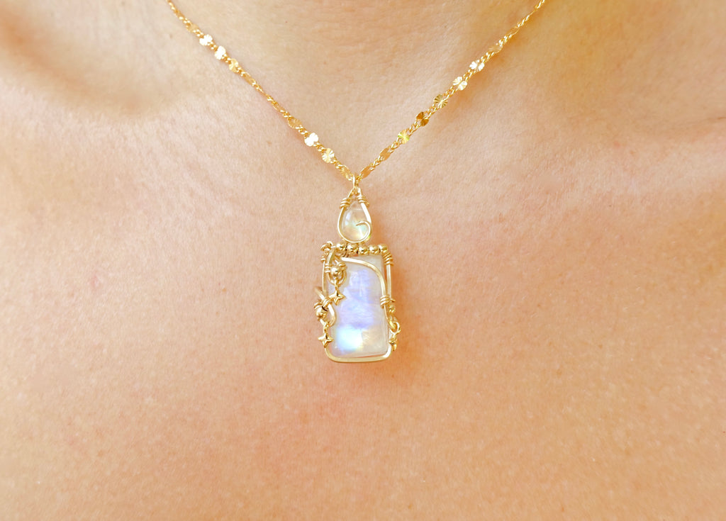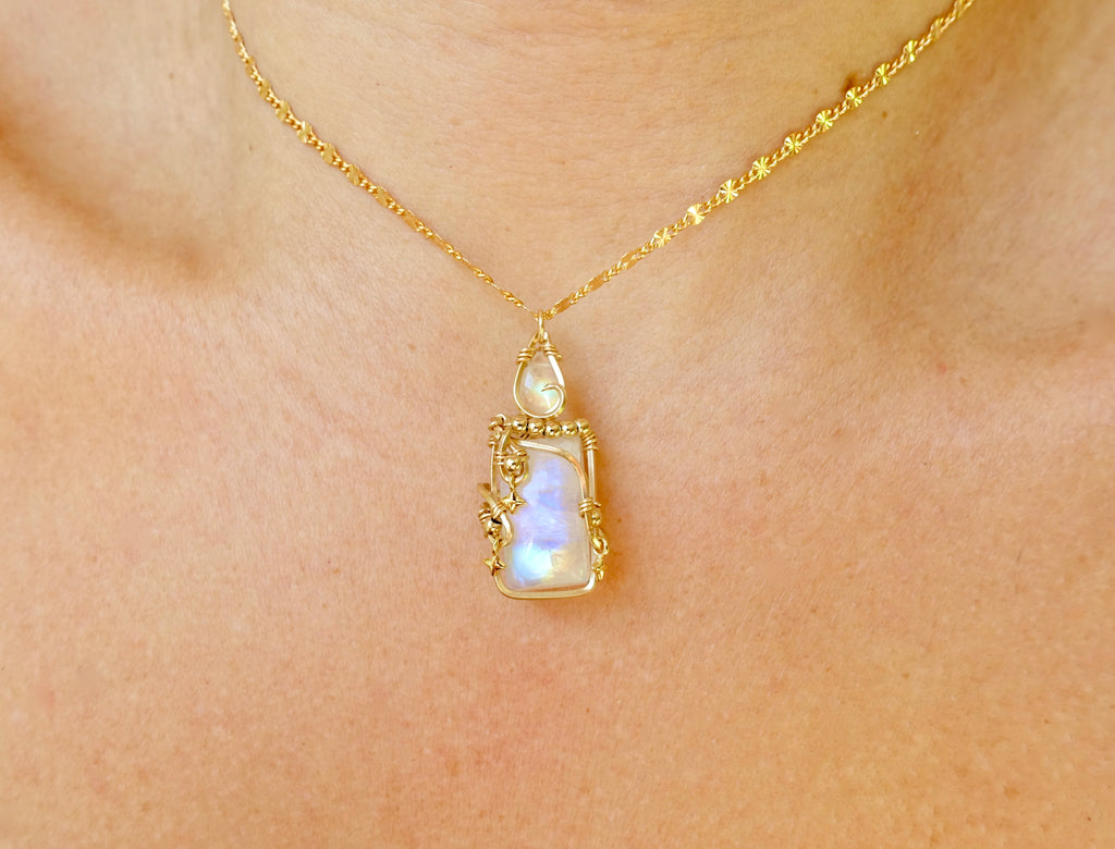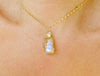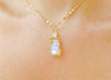 Inspired by Hocus Pocus, this unique design features a stunning boulder opal "candlestick", faceted black opal "flame", and 14k gold fill wire. It sits at a height of 1.5 inches. Please choose between a 16 or 18 inch 14k gold fill chain.