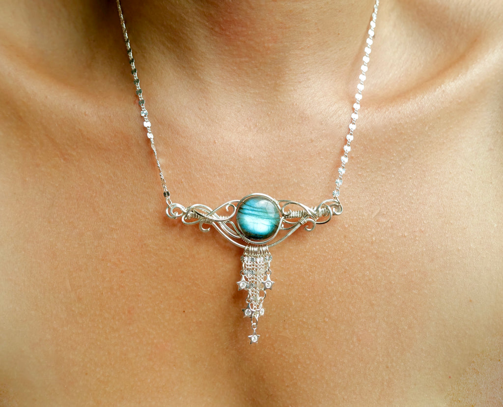 This unique design features a large labradorite bead, a small rainbow moonstone bead, five silver star charms, and sterling silver wire. It sits at a height of 2 inches. Please choose between a 16, 18, or 20 inch sterling silver chain.