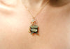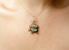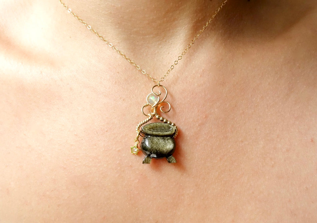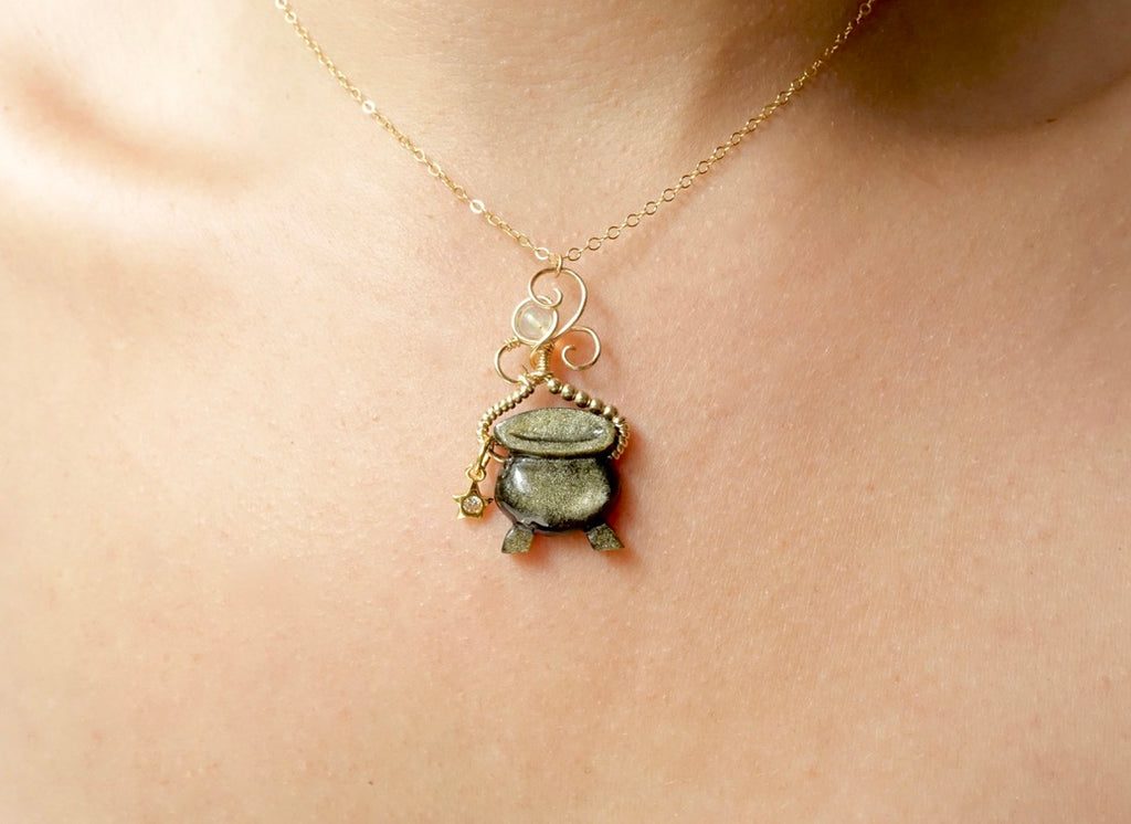 Tap into the spirit of spooky season with this carved gold sheen obsidian cauldron that includes a black Ethiopian opal and gold star charm. It sits at a height of 2 inches and a width of .5 inches. Please choose between an 16 or 18 inch 14k gold fill chain.