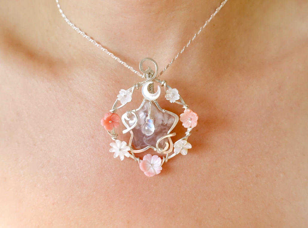 This unique design features a carved flower agate star, a carved crescent moon, four carved pearl flowers, three carved pink conch shell flowers, and sterling silver wire. It sits at a height of 2 inches. Please choose between a 16, 18 or 20 inch sterling silver chain.