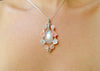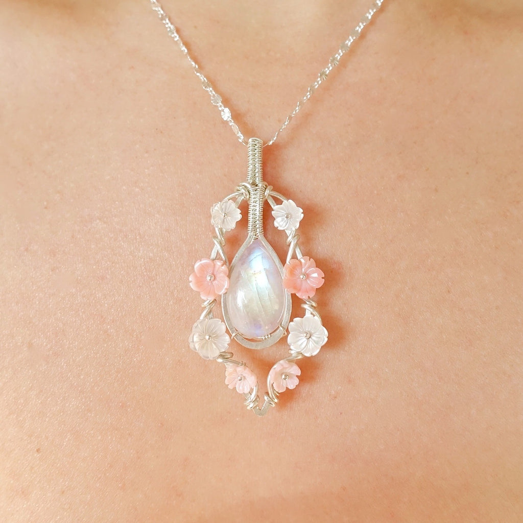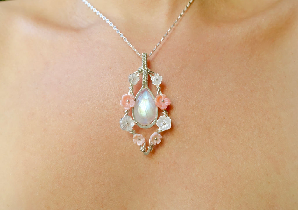 This unique design features a stunning rainbow moonstone cabochon, four carved pearl flowers, four carved pink conch shell flowers, and sterling silver wire. It sits at a height of 2.5 inches. Please choose between a 16, 18 or 20 inch sterling silver chain.