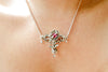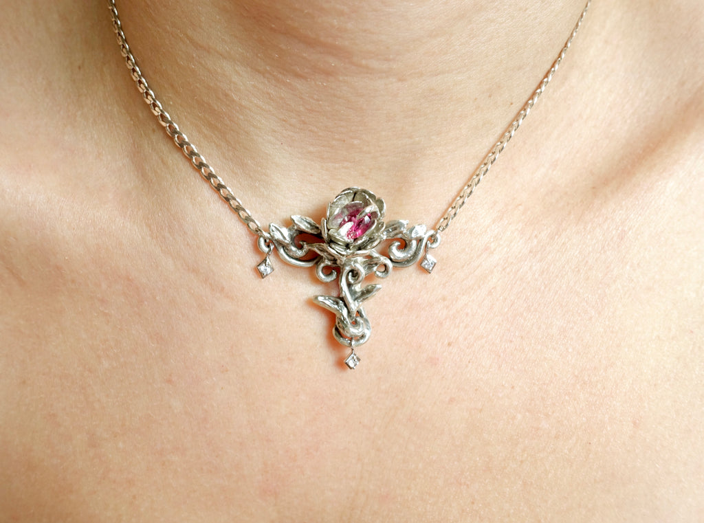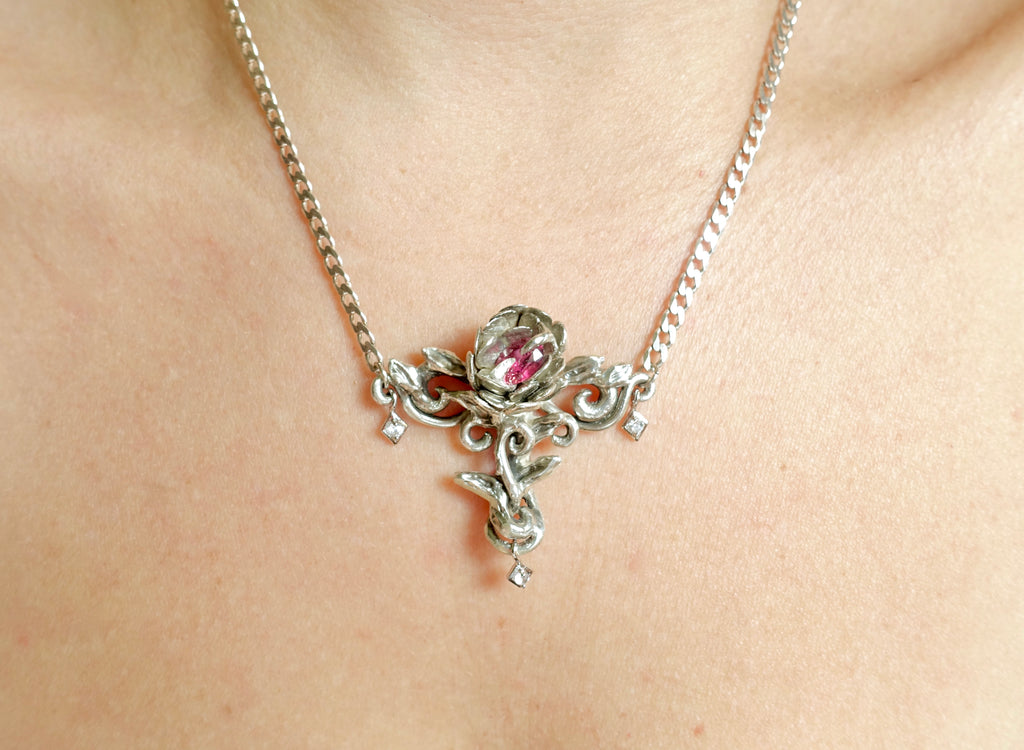 This unique floral design features a beautiful pink tourmaline bloom. It was crafted from sterling silver that I personally melted down and reformed. It sits at a height of 1.5 inches. Please choose between a 16, 18, or 20 inch sterling silver chain.