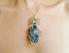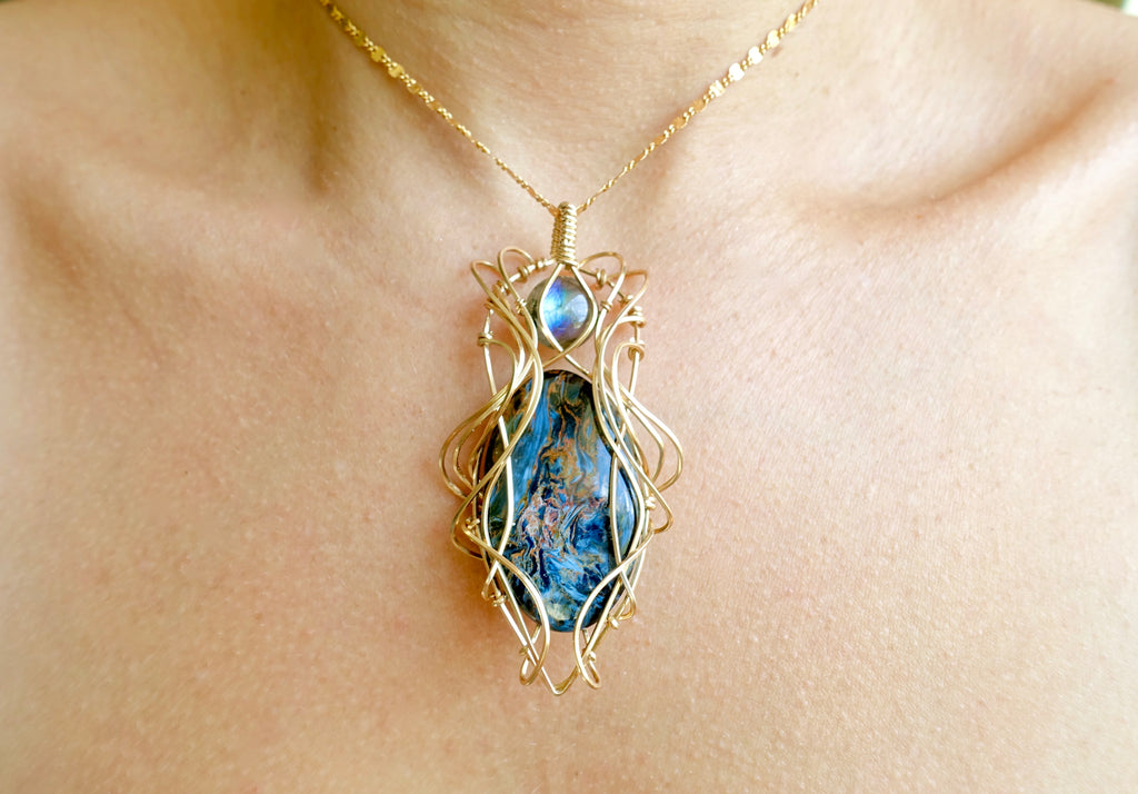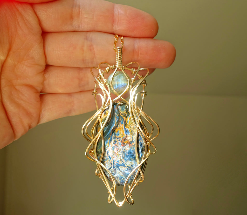 This unique design features a large petersite cabochon, a labradorite bead, and 14k gold fill wire. It sits at a height of 3 inches. Please choose between a 16 or 18 inch 14k gold fill chain.