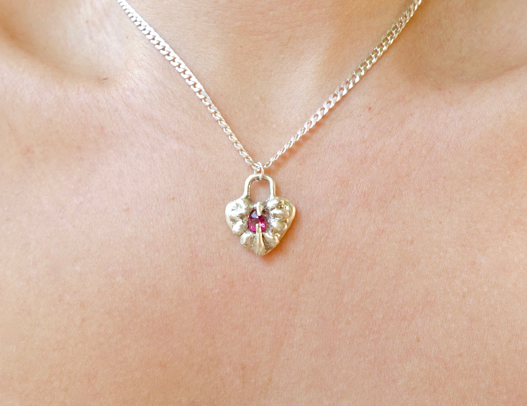 This unique floral design features a beautiful pink tourmaline center. It was crafted from sterling silver that I personally melted down and reformed. It sits at a height of .75 inches. Please choose between a 16, 18, or 20 inch sterling silver chain.