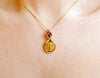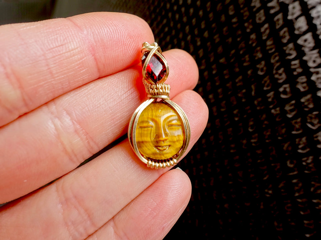 This unique design features a carved tigers eye moon face, faceted Mozambique garnet, and 14k gold fill wire. It sits at a height of 1.2 inches. Please choose between a 16 or 18 inch 14k gold fill chain.